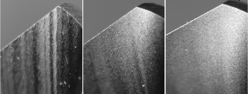 Figure 4: Drill tip: increasing preparation intensity depending on the application from left (as delivered) to right. At present high performance drills are often chamfered and rounded. For drilling cast iron rounding of the primary edge in the range of 60-120µm is commonly used. Often it is precisely added to the primary edge by brushing manually or using robots.